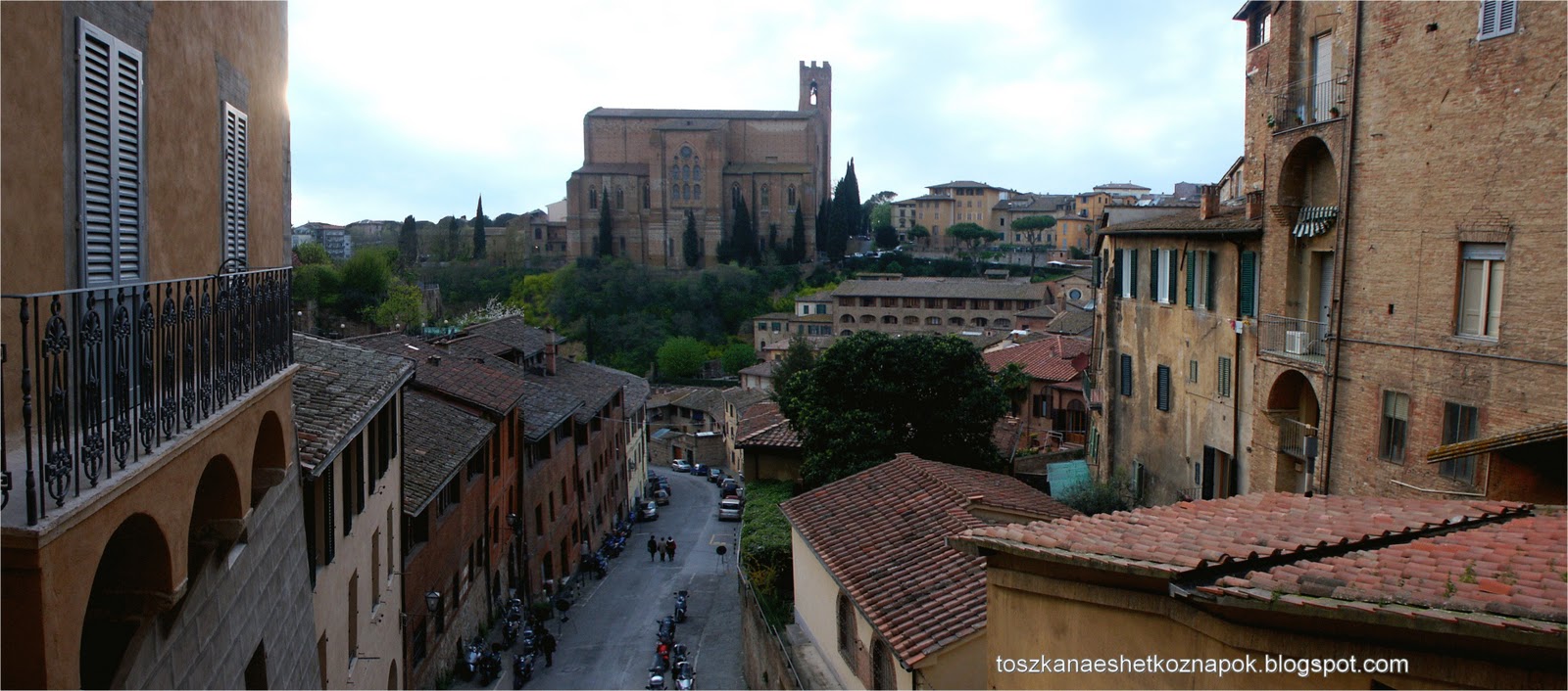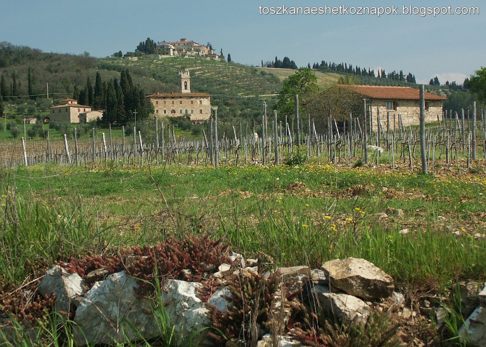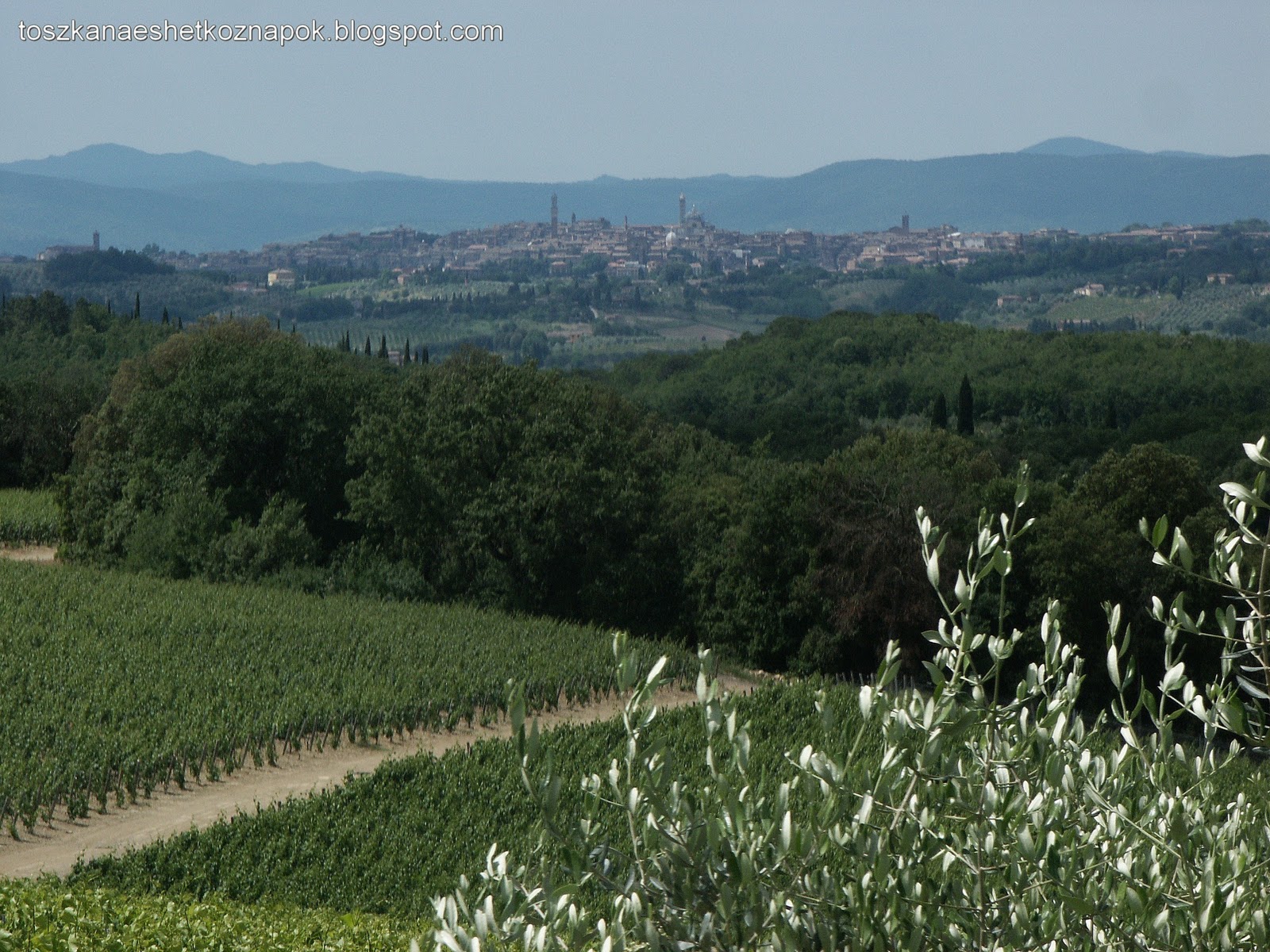 A korai vacsora alatt végig zuhogott az eső, de indulásra készen álltunk, hogy amint egy kicsit eláll, bejárhassuk a környéket. Persze minden csupa sár volt, de azért felmásztunk Cacchiano dombjára, és félúton megcsodáltuk az elénk táruló panorámát, a háttérben Sienával.